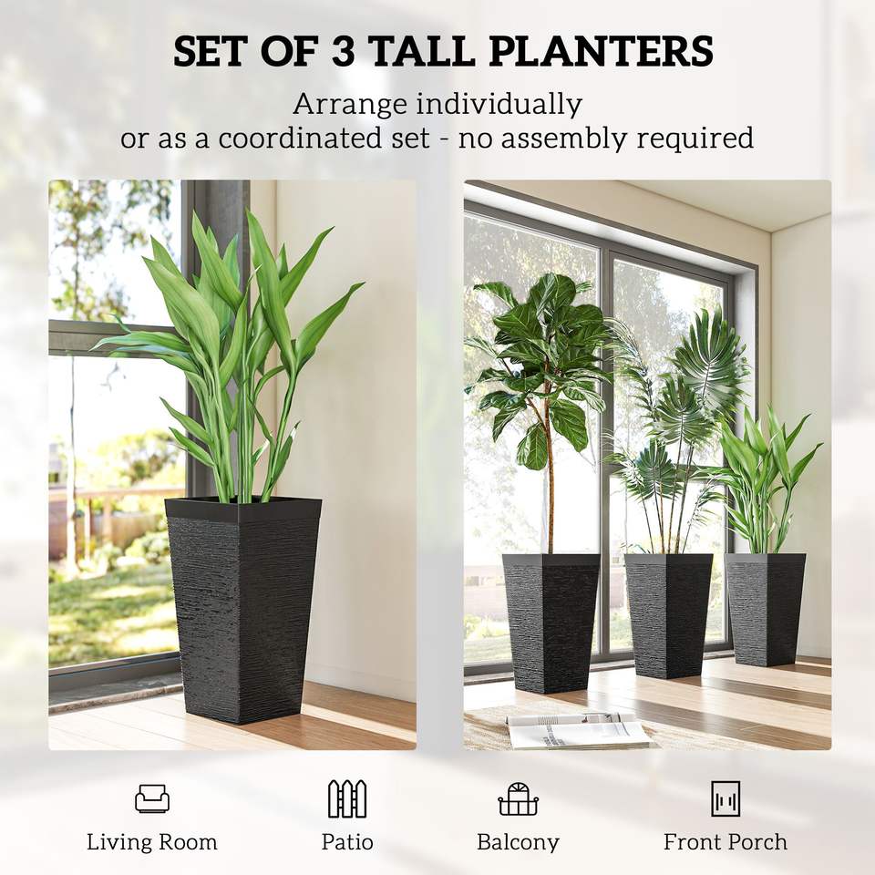 กระถางต้นไม้กลางแจ้งสีดำขนาด 22.8 นิ้ว ชุด 3 ใบ พร้อมล้อ ดีไซน์ทรงเรียว สามารถวางซ้อนกันได้ มีรูระบายน้ำ สำหรับปลูกดอกไม้ ใช้ได้ทั้งภายในและภายนอกอาคาร