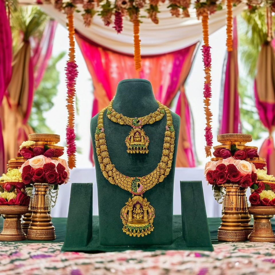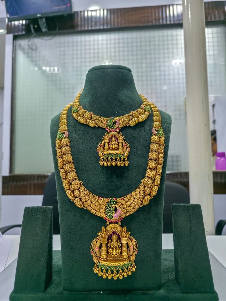 ชุดเครื่องประดับเจ้าสาวโบราณทองคำแท้ 22K แบบโบราณ ประกอบด้วยสร้อยคอยาวแบบราณีฮาร์ พร้อมจี้รูปพระลักษมี สำหรับงานแต่งงานแบบอินเดีย