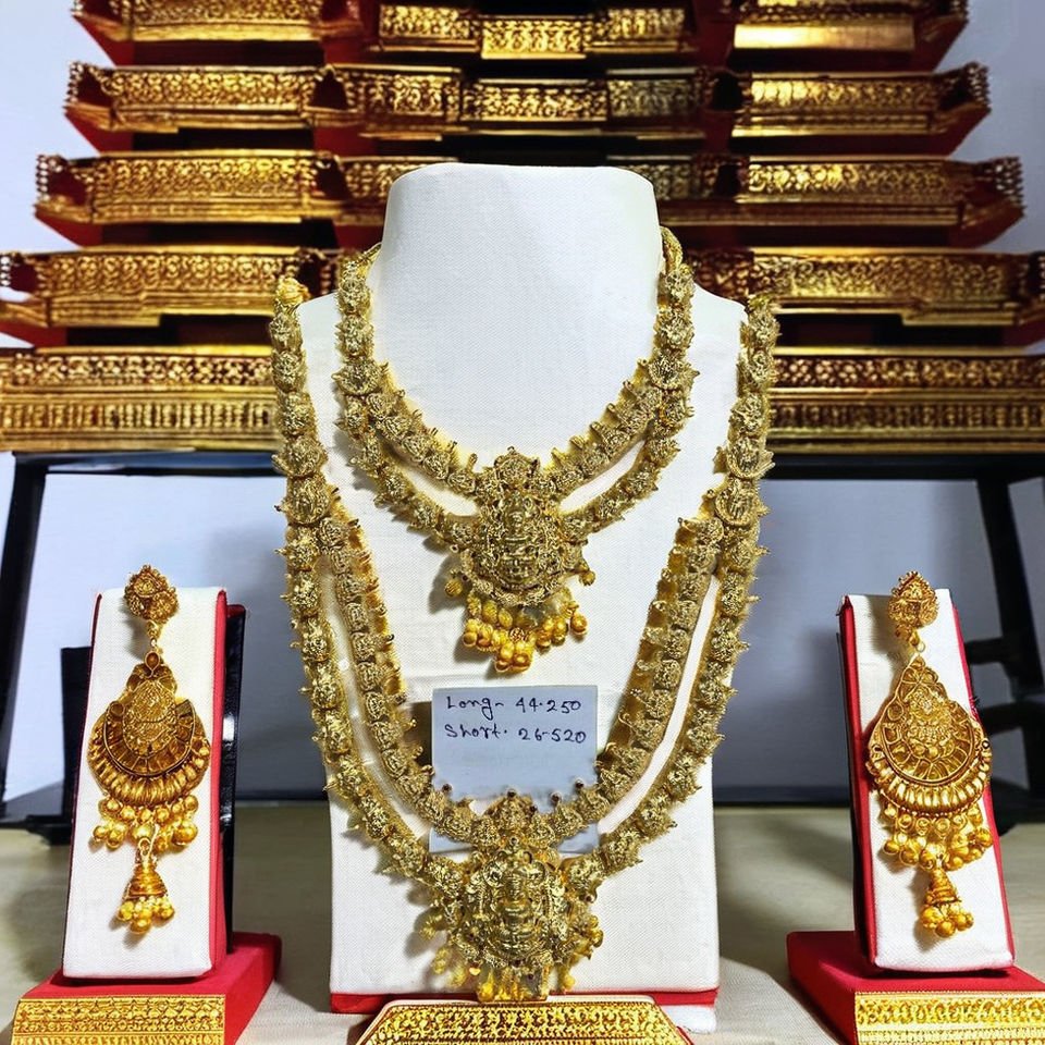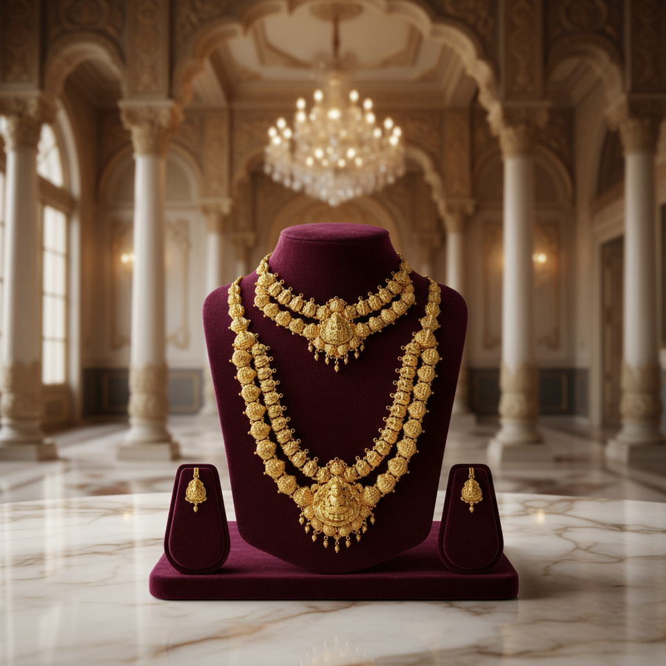 ชุดสร้อยคอทองคำแท้ 22K ลายวัด | เครื่องประดับเจ้าสาวแบบดั้งเดิมของอินเดีย | งานฝีมือเคลือบทองโบราณแบบแฮรัม