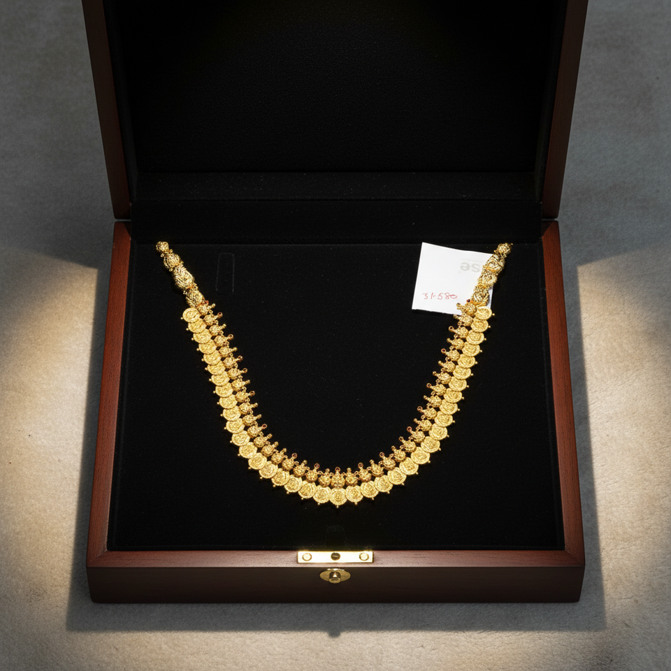 ชุดสร้อยคอทองคำแท้ 22K ลายวัด | เครื่องประดับเจ้าสาวแบบดั้งเดิมของอินเดีย | งานฝีมือเคลือบทองโบราณแบบแฮรัม