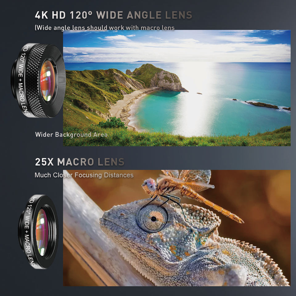 เลนส์โทรศัพท์มือถือ 4-in-1 สำหรับ Pentax/Sigma ใช้ได้กับโทรศัพท์ทุกรุ่น ประกอบด้วยเลนส์เทเลโฟโต้ 22X, เลนส์มุมกว้าง 120, เลนส์ฟิชอาย 205 และเลนส์มาโคร 25X