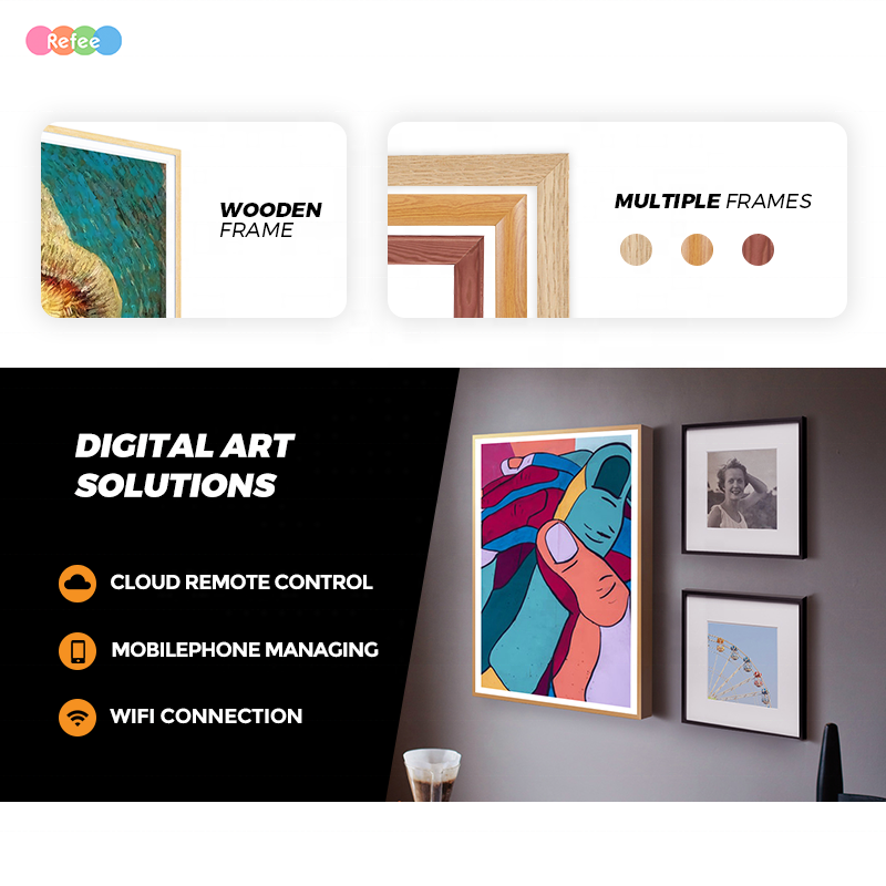 กรอบรูปดิจิตอลขนาด 22 นิ้ว 32 นิ้ว 40 นิ้ว 43 นิ้ว 55 นิ้ว พร้อม WIFI แอป Android หน้าจอแสดงผล 2k 4k สำหรับภาพศิลปะ NFT และภาพถ่าย แสดงผลงานศิลปะ
