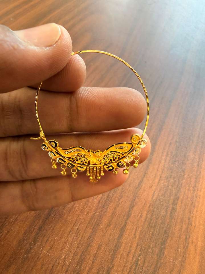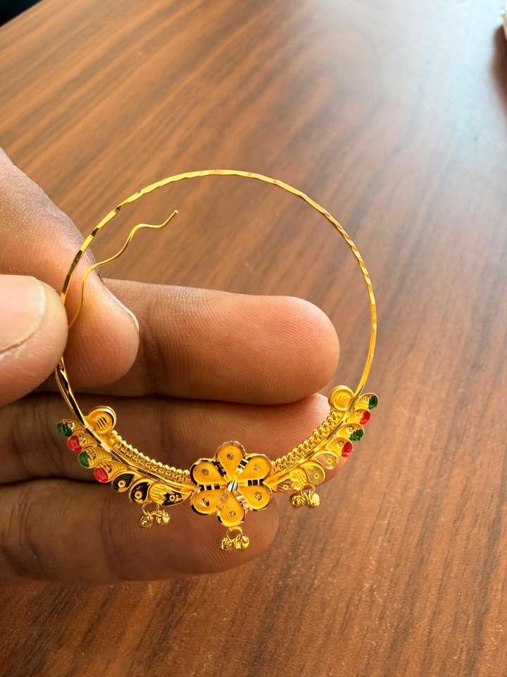 แหวนจมูกทองคำแท้ 22k แบบอินเดียสำหรับงานแต่งงาน เครื่องประดับเจ้าสาว นาท ลายดอกไม้เคลือบสีรูปนกยูง ดีไซน์ห่วงขนาดใหญ่ พร้อมสายเจาะ
