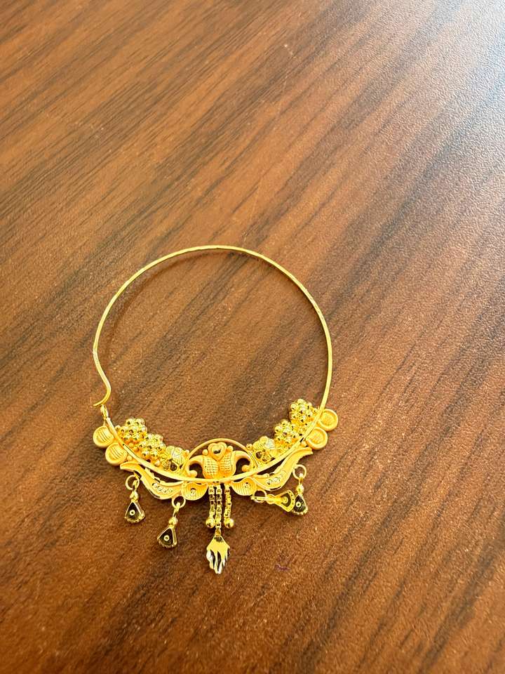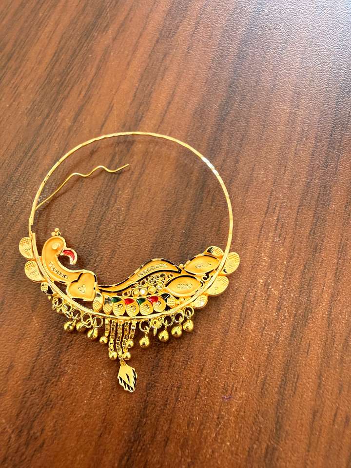 แหวนจมูกทองคำแท้ 22k แบบอินเดียสำหรับงานแต่งงาน เครื่องประดับเจ้าสาว นาท ลายดอกไม้เคลือบสีรูปนกยูง ดีไซน์ห่วงขนาดใหญ่ พร้อมสายเจาะ