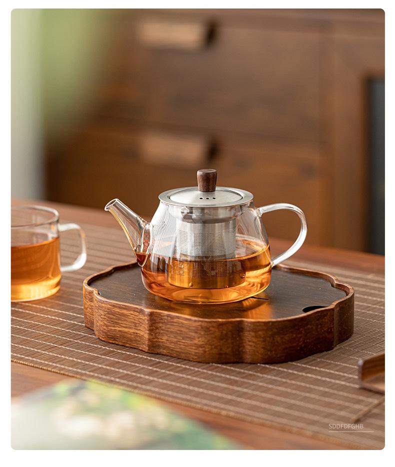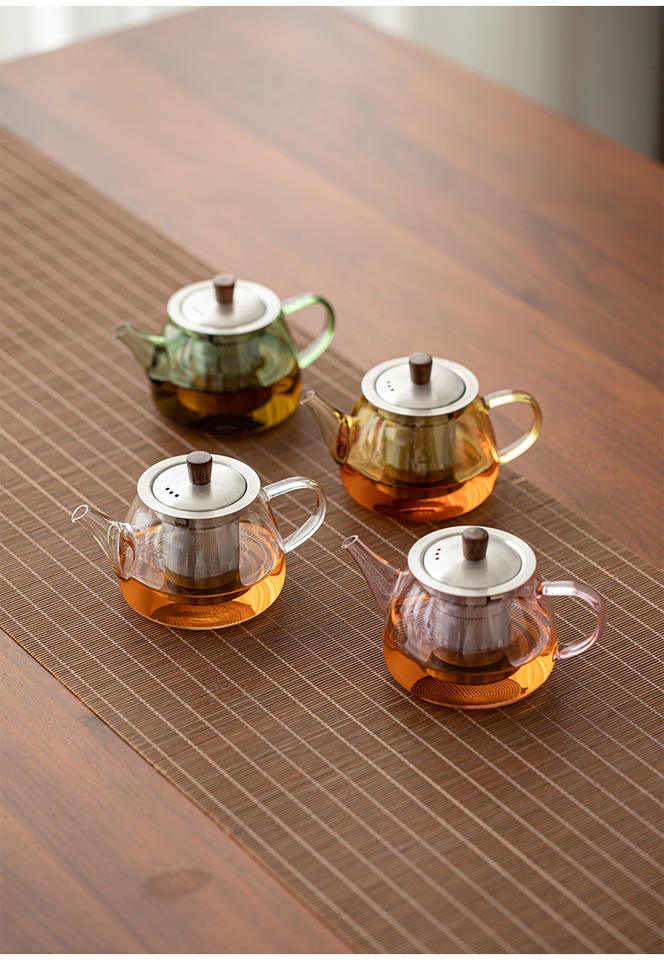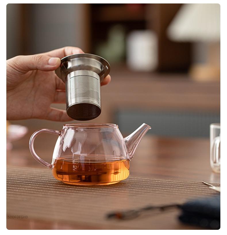 กาน้ำชาแก้วโบโรซิลิเกตเป่าด้วยมือขนาดเล็ก 230 มล. 8 ออนซ์ สำหรับใช้กับเตาได้ พร้อมที่กรองชาสแตนเลสแบบส่วนตัว