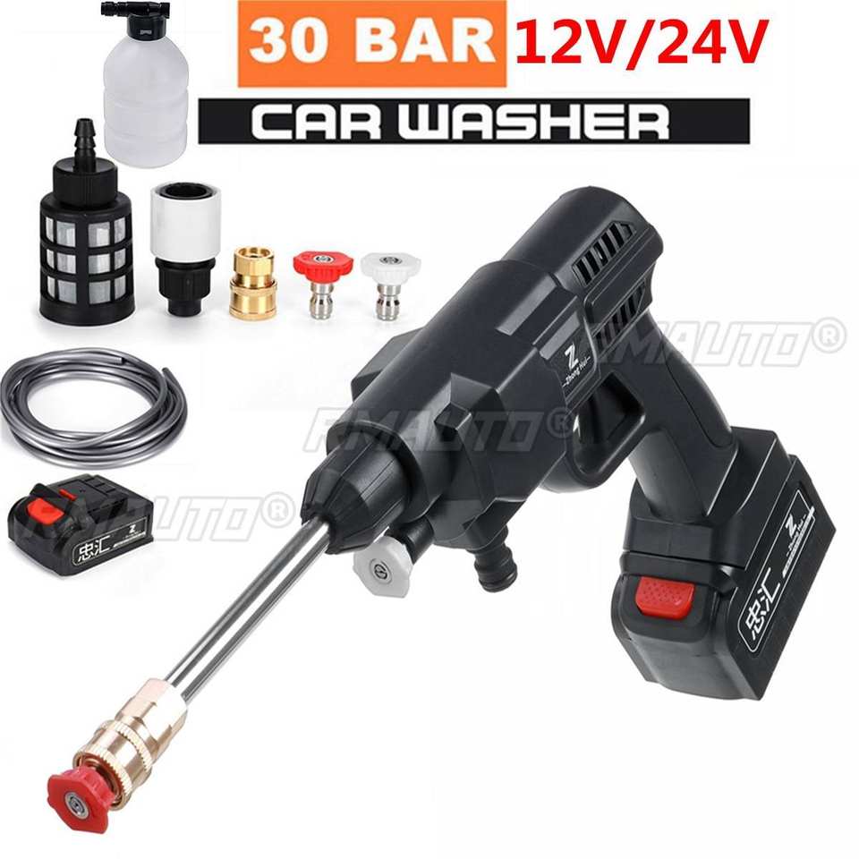 เครื่องฉีดน้ำล้างรถ 24/12V แรงดันสูง 30 บาร์ พร้อมปืนฉีดน้ำและเครื่องทำโฟม สำหรับล้างรถ ใช้แบตเตอรี่ 1/0 แบบไร้สาย/มีสาย