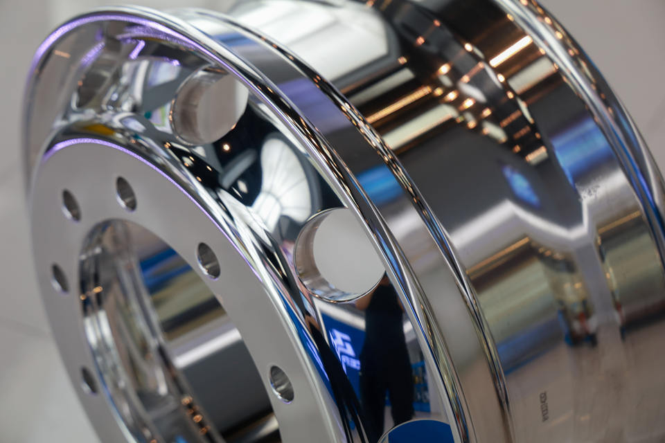 กระทะล้อรถบรรทุกอะลูมิเนียมขนาด 24.5x8.25 นิ้ว สีดำ ผ่านการรับรองมาตรฐาน TUV รับประกันตลอดอายุการใช้งาน พร้อมโลโก้สั่งทำพิเศษสำหรับงานวิศวกรรม