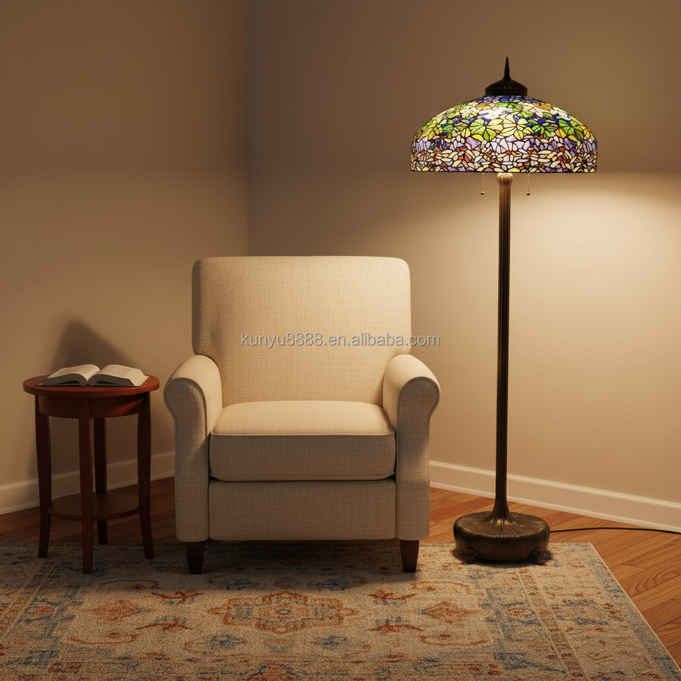 โคมไฟตั้งพื้นสไตล์ยุโรปคุณภาพสูงขนาด 24 นิ้ว ผลิตจากโรงงานในจีน ฐานทองเหลือง กระจกสี งานฝีมือเชื่อมดีบุก เหมาะสำหรับห้องนั่งเล่น ห้องนอน