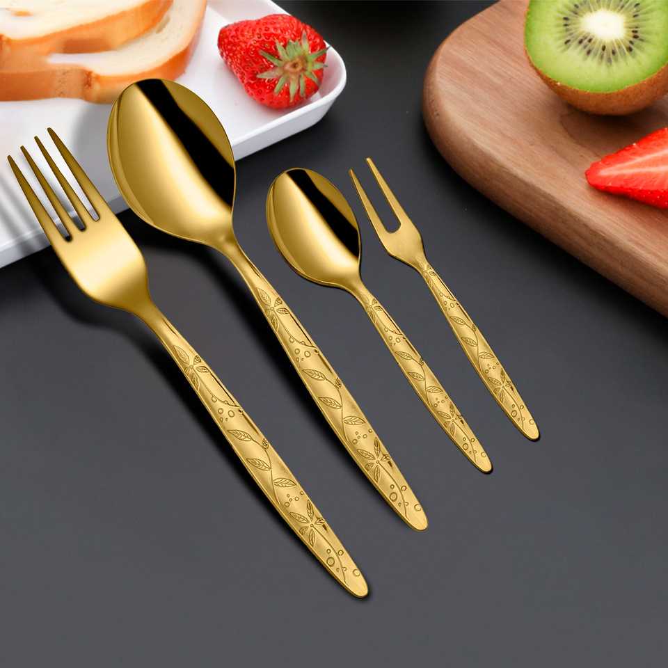 ชุดช้อนส้อมสแตนเลสสีทอง24ชิ้นพร้อมเคลือบใบเทสโก้สำหรับใช้ในงานปาร์ตี้และของตกแต่ง