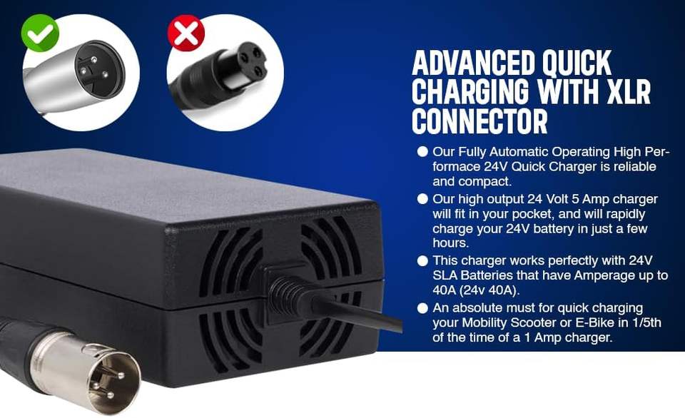 24V 5A Battery Charger (3-Pin XLR Connector) for Pride Mobility, Drive Medical, GoGo Elite Traveller, Jazzy Chair, Lakematic