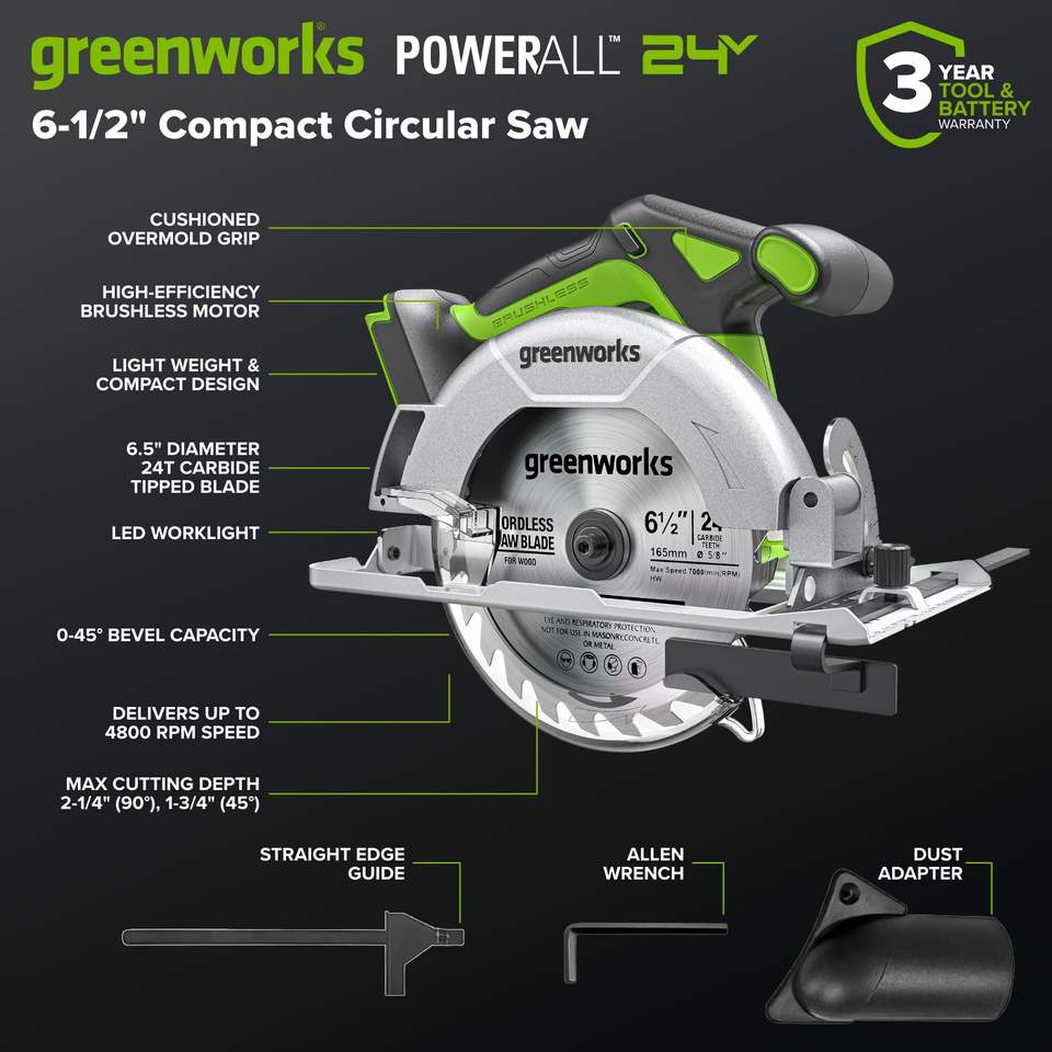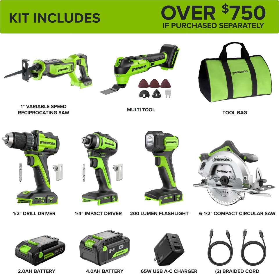 ชุดเครื่องมือไร้สาย 24V แบบไร้แปรงถ่าน 6-in-1 ประกอบด้วย สว่าน/ไขควงกระแทก เลื่อยวงเดือน 6.5 นิ้ว เลื่อยฉลุ เครื่องมืออเนกประสงค์ ไฟฉาย ตัวเครื่องทำจากพลาสติกทั้งหมด