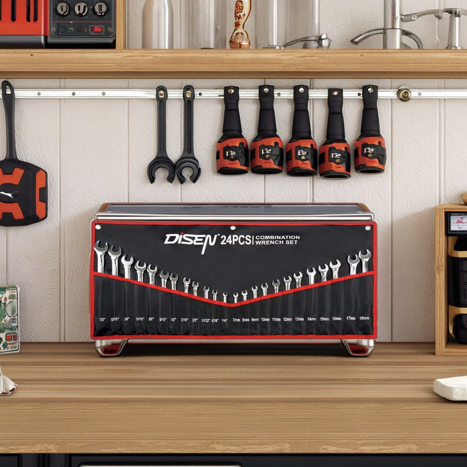 ชุดประแจเหล็กชุบโครเมียมผสมขนาด7-18มม. 1/4-7/8 "ม้วนเครื่องมือซ่อมอุตสาหกรรม DIY แบบปลายเปิด24ชิ้นปรับแต่งได้