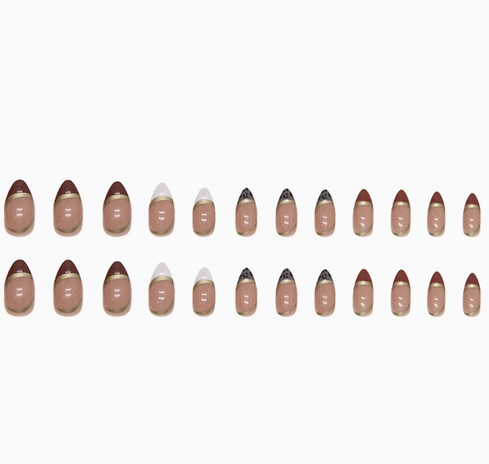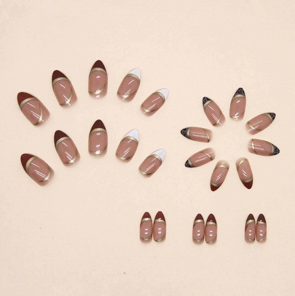 แผ่นกดเล็บอะคริลิครูปทรงอัลมอนด์24ชิ้นสำหรับผู้หญิงพิมพ์ลายเสือดาวและลายเส้นสีทอง