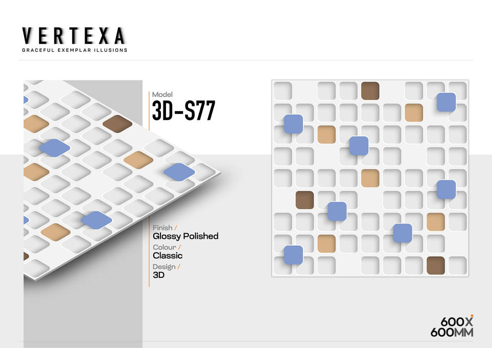 กระเบื้องเซรามิกพอร์ซเลนขัดเงา ลายสี่เหลี่ยมจัตุรัส ขนาด 24x24 นิ้ว (600x600 มม.) รุ่น 3D S77 ผิวมันเงา สำหรับตกแต่งห้องนั่งเล่นและห้องนอน