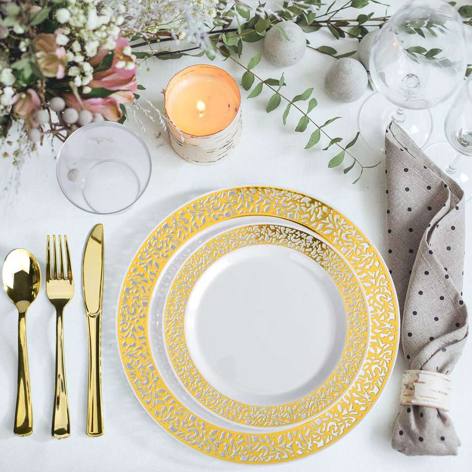 ชุดภาชนะอาหารแบบใช้แล้วทิ้งสำหรับแขก25คนช้อนส้อมจานเค้กขนมหวานถ้วยพลาสติกขนาด9ออนซ์ดีไซน์ลูกไม้สีขาวทอง PS