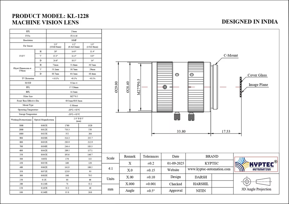 เลนส์วิชันซิสเต็มขนาด 25 มม. พร้อมเลนส์ 10 ล้านพิกเซล และรูปแบบเลนส์ 2/3 นิ้ว สำหรับระบบอัตโนมัติในโรงงานและการตรวจสอบอัจฉริยะ