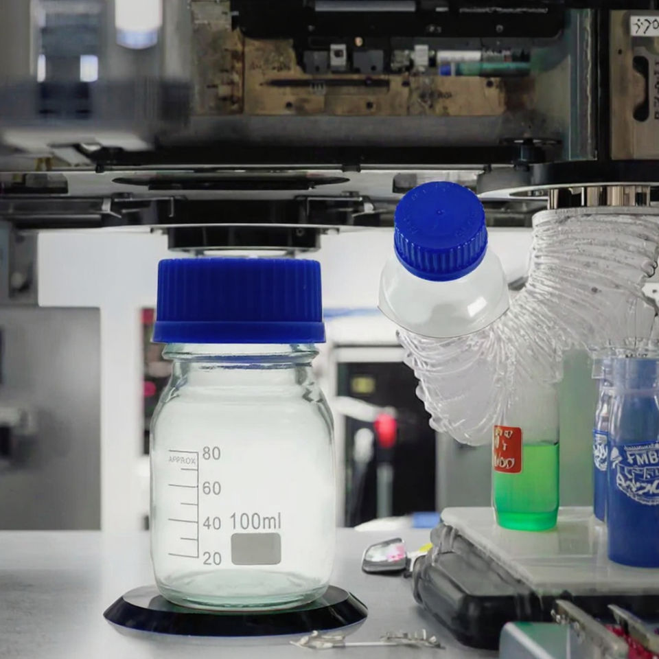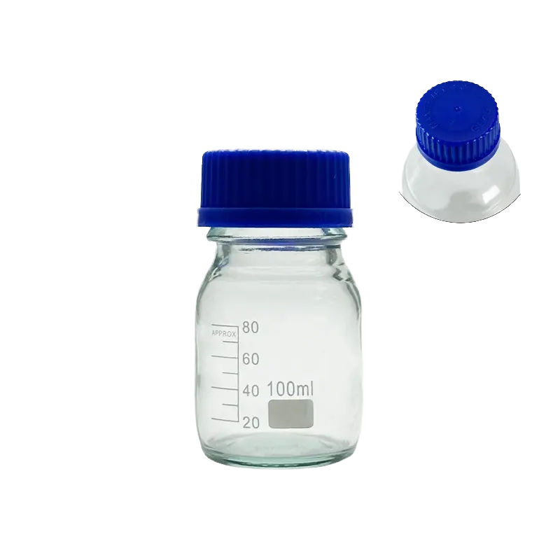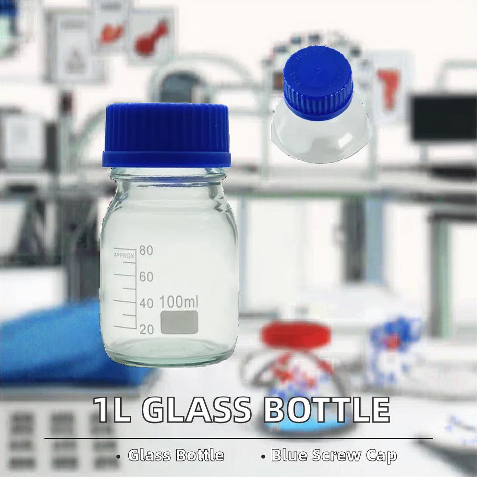 ขวดแก้วทรงกลมสำหรับห้องปฏิบัติการขนาด 250 มล. ทำจากแก้วบอโรซิลิเกต พร้อมฝาเกลียวสีน้ำเงิน สำหรับเก็บสารอาหารและสารเคมี