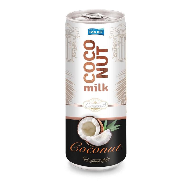 นมมะพร้าวปรุงแต่งรสชาติพร้อมเนื้อมะพร้าว 250 มล. บรรจุกระป๋องอะลูมิเนียม NFC บริสุทธิ์ 100% ได้รับการรับรองฮาลาลและ ISO 22000 ผลิตภัณฑ์ OEM ผลิตในเวียดนาม