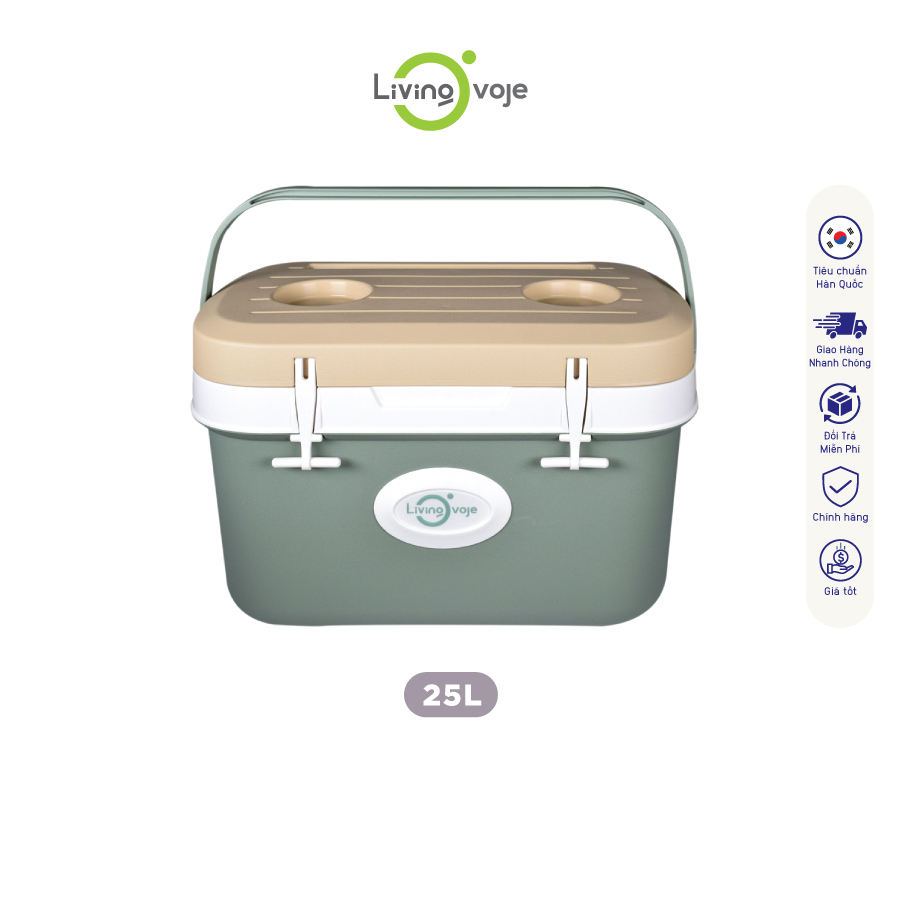 กล่องเก็บความเย็นแบบพกพาขนาด 25 ลิตร พร้อมโต๊ะวางของและที่วางแก้ว สีเขียวเบจ สำหรับปิกนิกกลางแจ้ง ผลิตในเวียดนาม รับผลิตแบบ OEM/ODM พร้อมสกรีนโลโก้