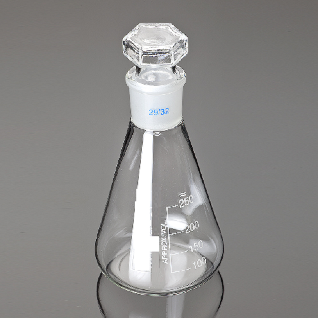 กระติกน้ำทรงกรวยบอโรซิลิเกตขนาด250มล. พร้อมจุกแก้วแบบแคบสำหรับใช้ในห้องปฏิบัติการเคมี