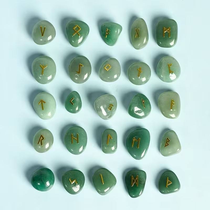 25pcs/set Engraved Natural Crystals Heart Rune Stone Green Aventurine Divination Stone Reiki Energy Fortune-telling Stones Set