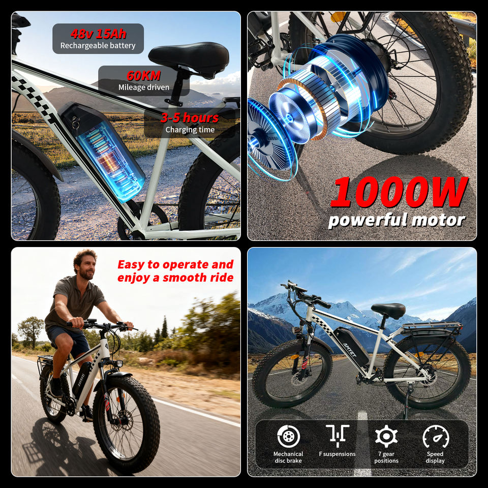 จักรยานไฟฟ้า City Bike ขนาด 26 นิ้ว 48V 15AH แบตเตอรี่ลิเธียม มอเตอร์ 1000W ระบบช่วยปั่นแบบอิเล็กทรอนิกส์ เซ็นเซอร์ 7 สปีด ระยะทาง 50 กม. ดิสก์เบรกหน้า/หลัง