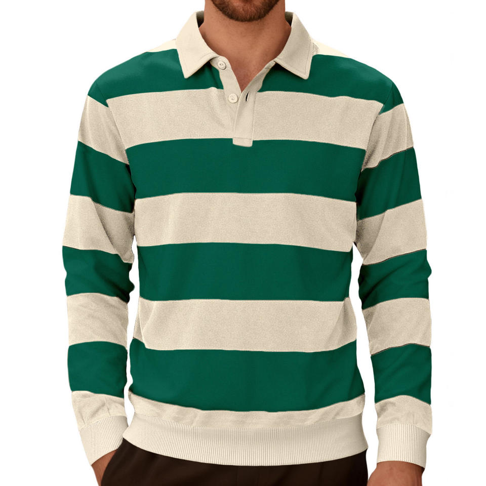 เสื้อโปโลแขนยาวลายทางสำหรับผู้ชาย 26 ตัว สีเขียวทหาร สีน้ำเงินกรมท่า สีน้ำตาลเข้ม บล็อกสีตัดกัน ติดกระดุม ใส่สบายๆ ลำลอง