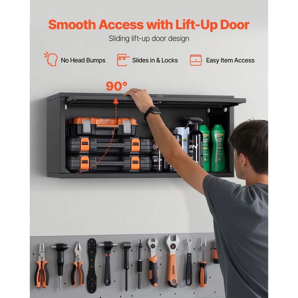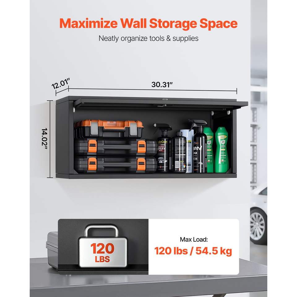 ตู้เก็บของติดผนังโลหะขนาด 27.56 นิ้ว x 12.01 นิ้ว x 14.02 นิ้ว สำหรับเก็บเครื่องมือในโรงรถ พร้อมบานประตูแบบพับขึ้น รับน้ำหนักได้ 120 ปอนด์ต่อชั้นวาง