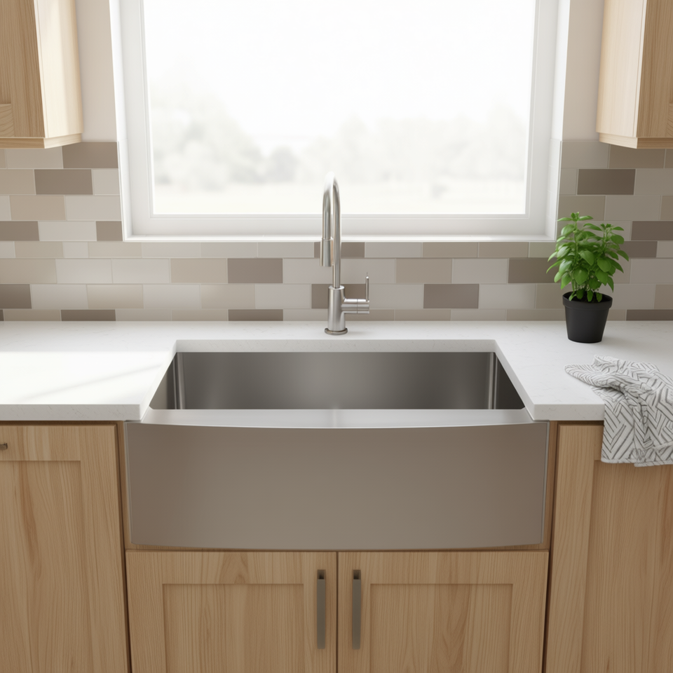 อ่างล้างจานสแตนเลสสตีลทรงฟาร์มเฮาส์ ขนาด 27x21x10 นิ้ว แบบอ่างเดี่ยว หนา 16 เกจ ผิวขัดเงา ทำความสะอาดง่าย