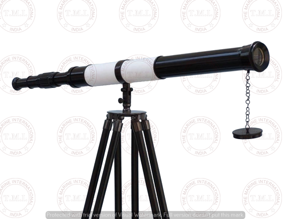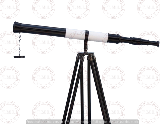 27 'nautical กล้องโทรทรรศน์ทองเหลืองสีดำโบราณ & สีขาวหนังพร้อมขาตั้งพื้นไม้ของตกแต่งบ้าน