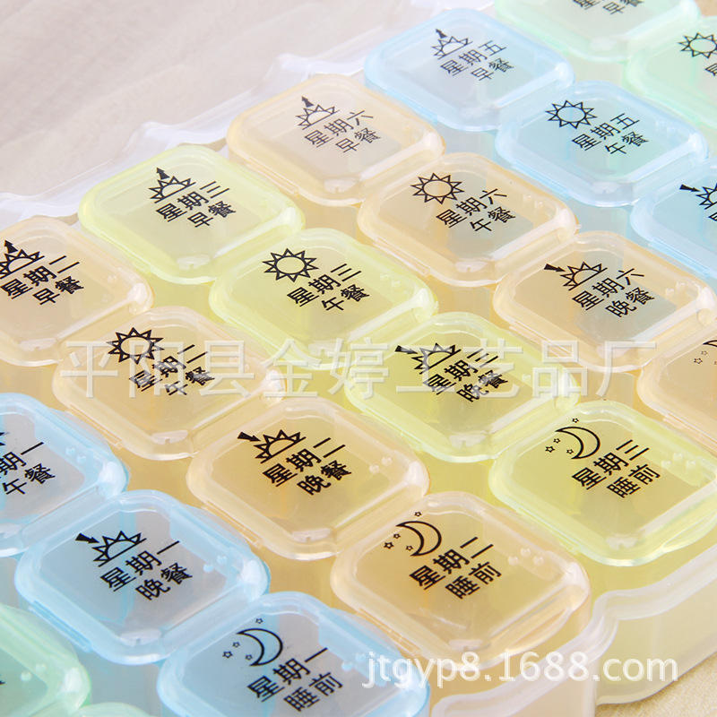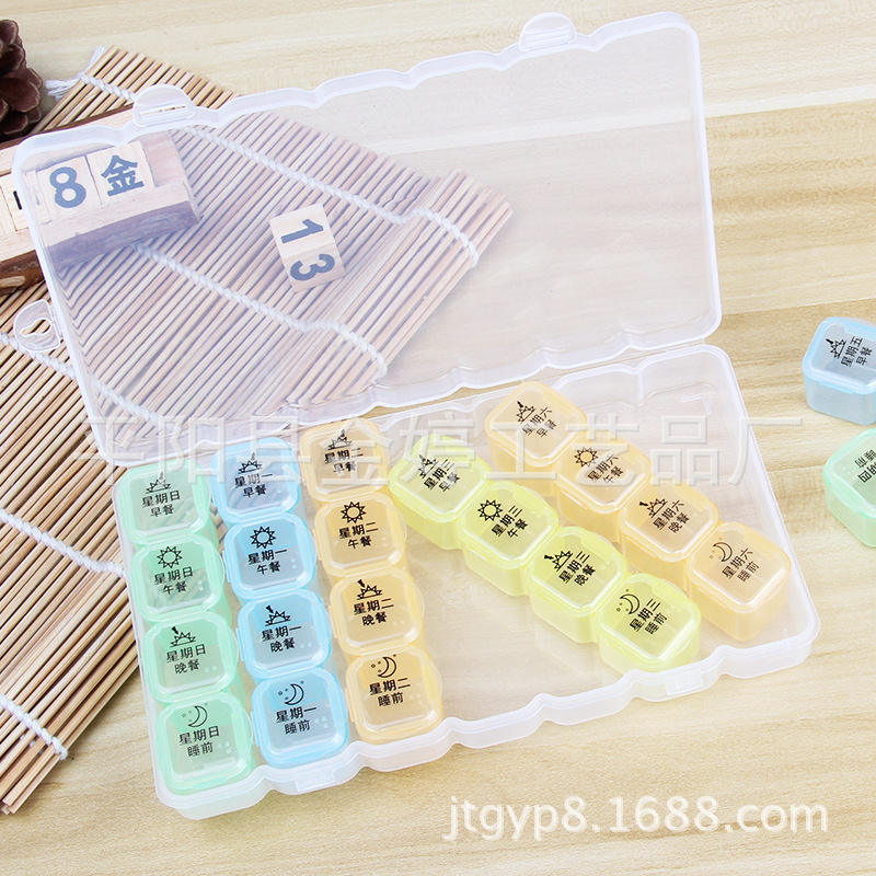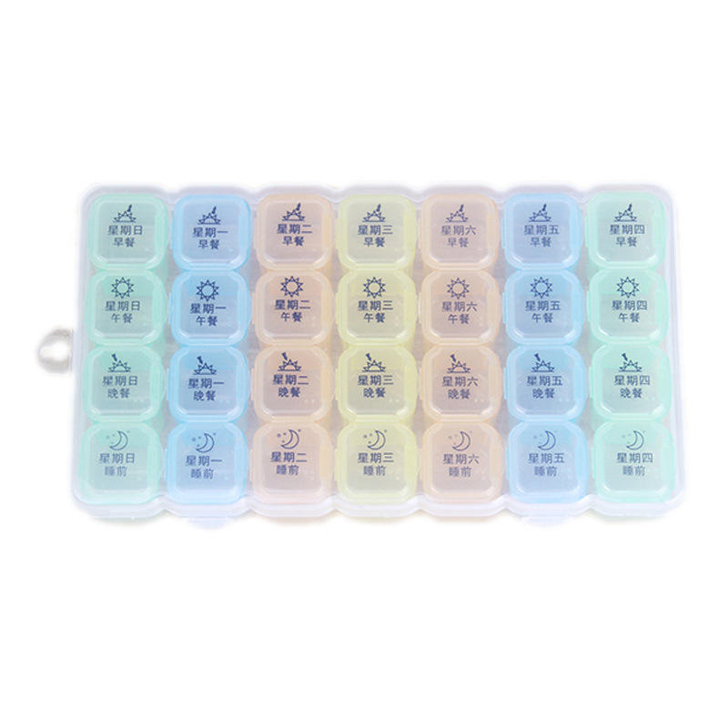 กล่องยาพลาสติก 28 ช่อง พร้อมคำแนะนำภาษาจีน ดีไซน์พกพาสะดวกสำหรับเก็บยา 1 สัปดาห์