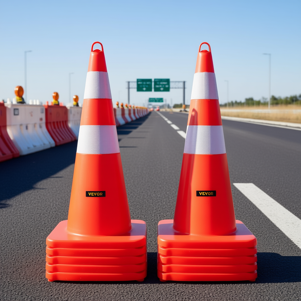 กรวยจราจรสีส้ม 28 ชิ้น พร้อมแถบสะท้อนแสงและฐานถ่วงน้ำหนักเพื่อความปลอดภัยบนท้องถนน