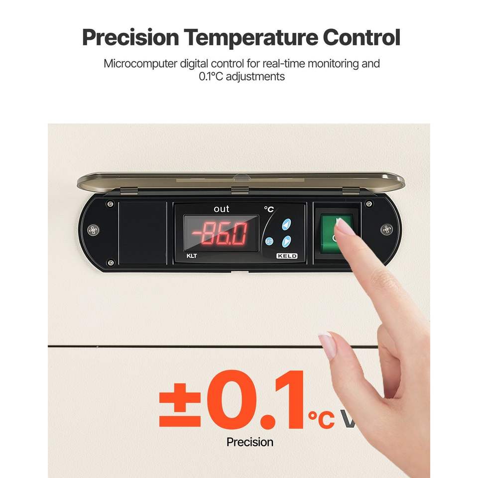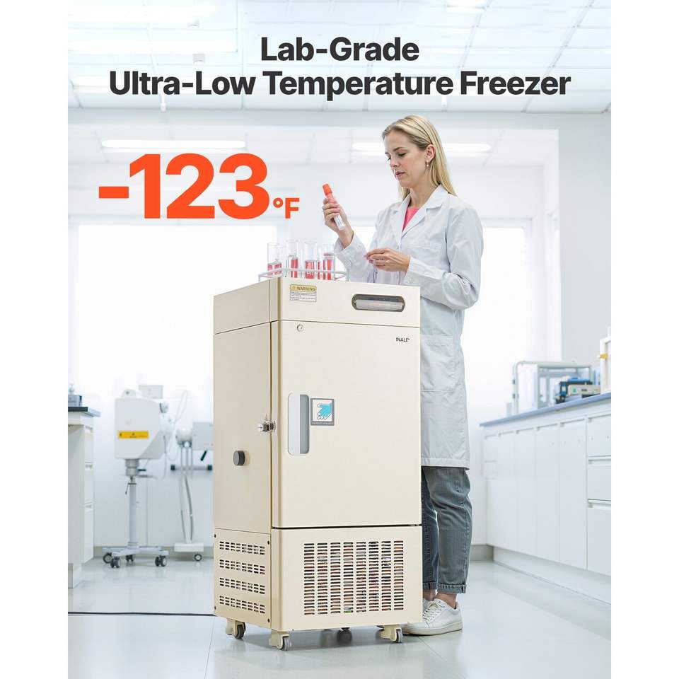 ตู้แช่แข็งอุณหภูมิต่ำพิเศษขนาด 28 ลิตร สำหรับห้องปฏิบัติการ ปรับอุณหภูมิได้ 40 ถึง 123 องศาฟาเรนไฮต์ พร้อมหน้าจอดิจิตอลและล้อเลื่อน
