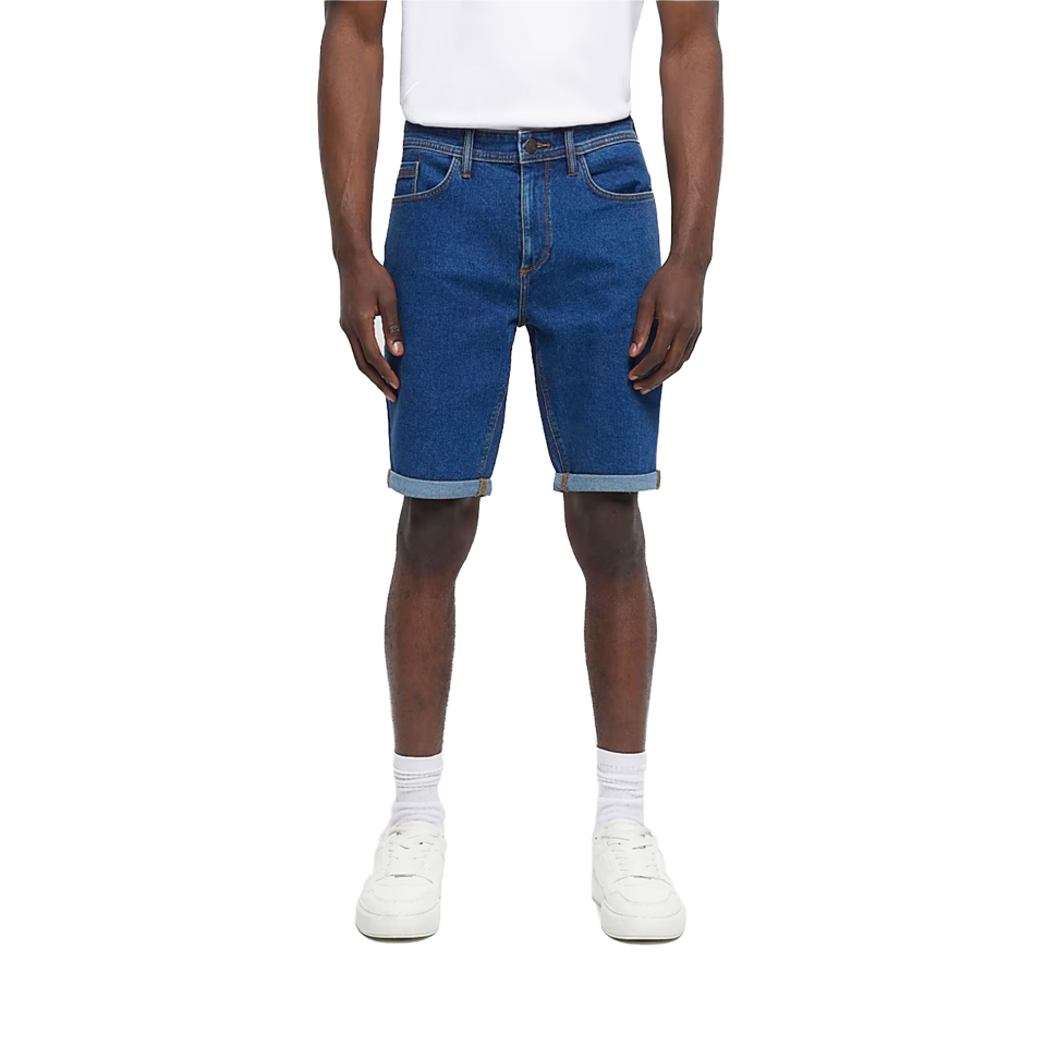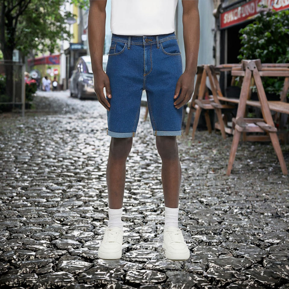 ผ้าเดนิมผสมโพลีเอสเตอร์ 28% ผ้าฝ้าย 70% และอีลาสเทน 2% ทรงเข้ารูปปานกลาง ขอบกางเกงเย็บตะเข็บ พร้อมห่วงเข็มขัด สีน้ำเงิน กางเกงขาสั้นลำลอง ปักลาย แห้งเร็ว