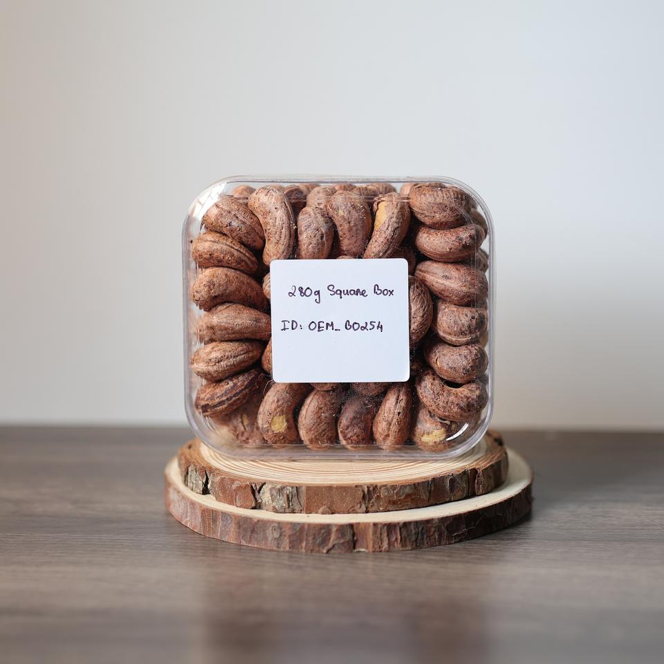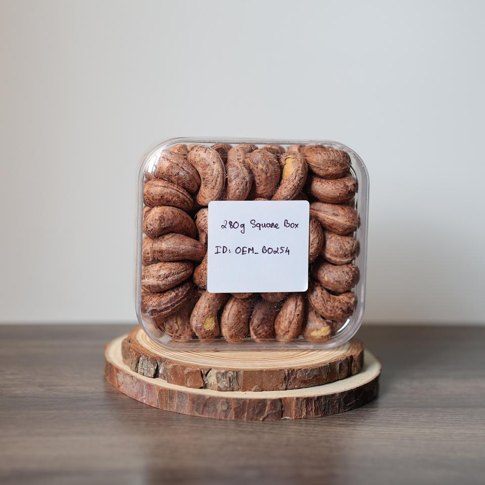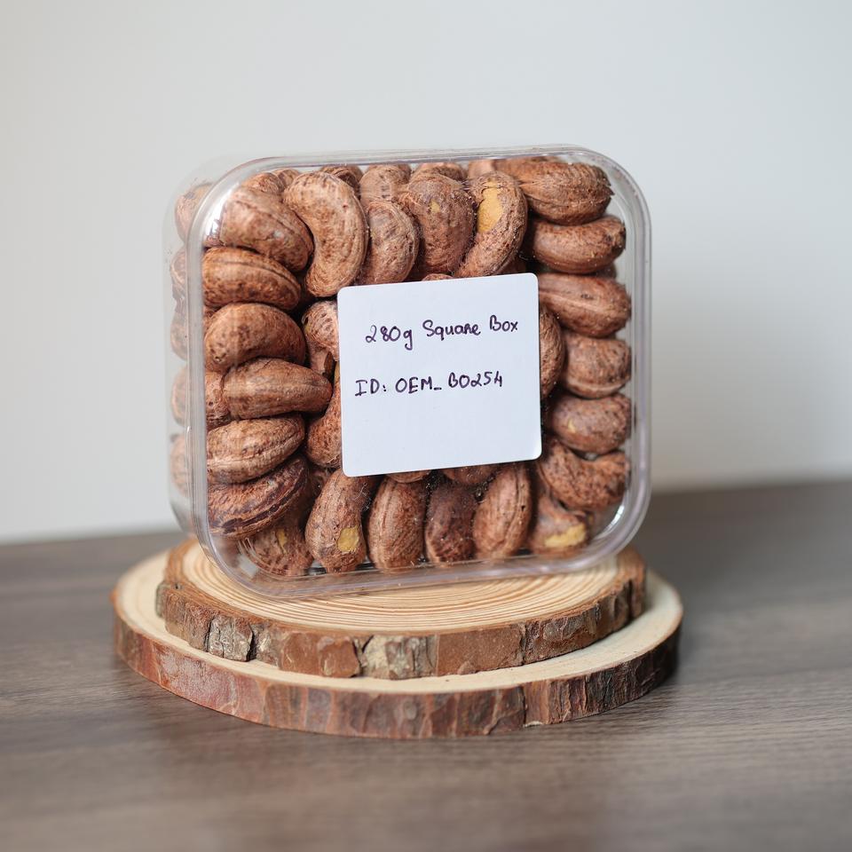 กล่องสี่เหลี่ยมขนาด280กรัมรสชาติเค็มแบบเนยพรีเมียมตัวอย่างฟรีมาตรฐาน ISO ขายส่งเม็ดมะม่วงหิมพานต์คั่วออร์แกนิก
