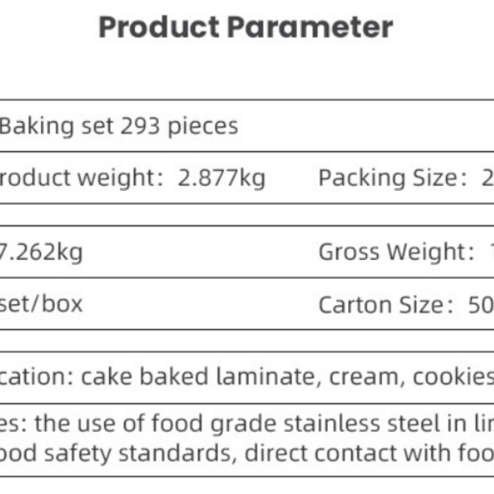 ชื่อผลิตภัณฑ์:ชุดอุปกรณ์ทำขนมและเค้ก 293 ชิ้น