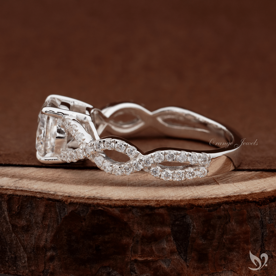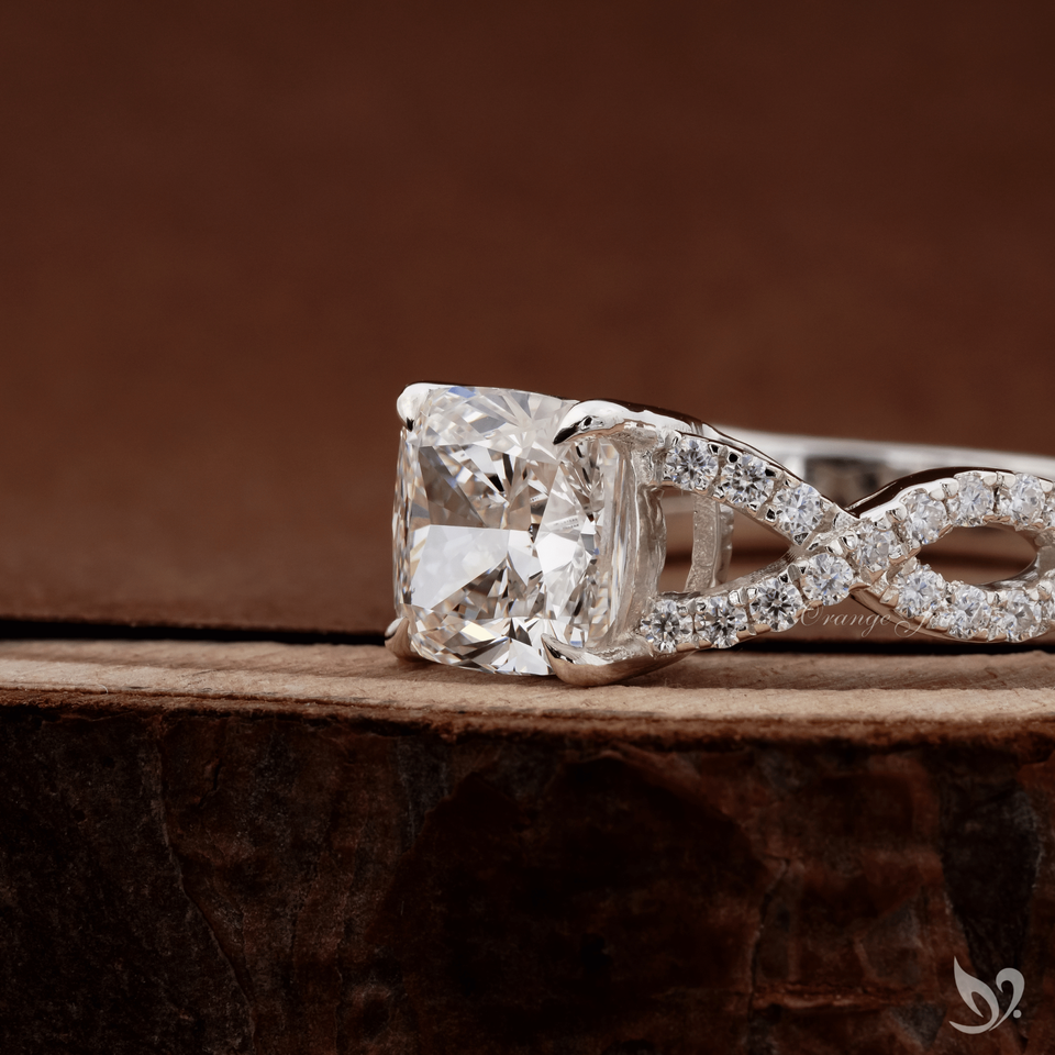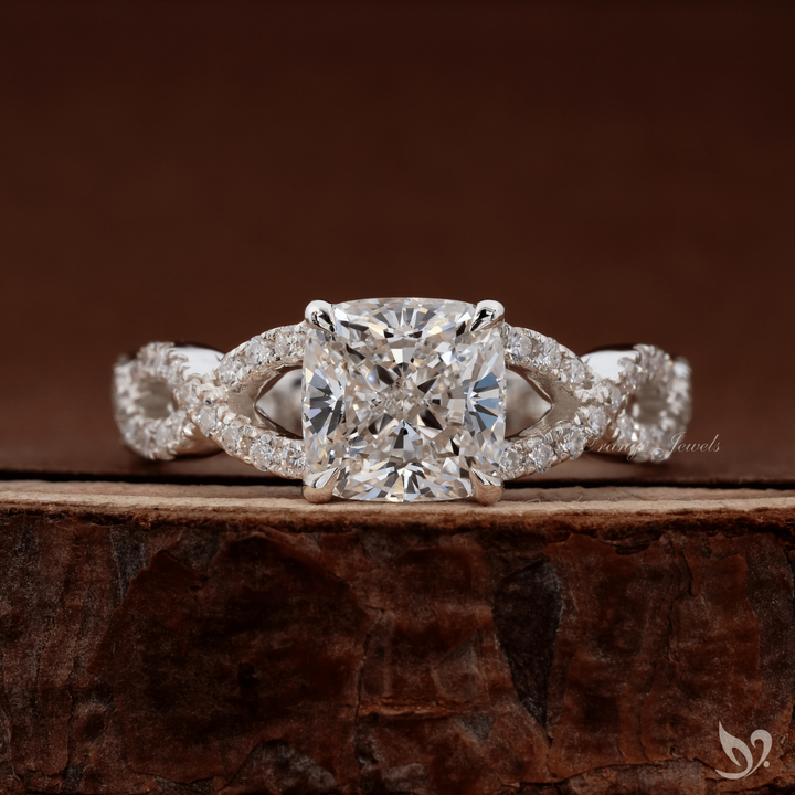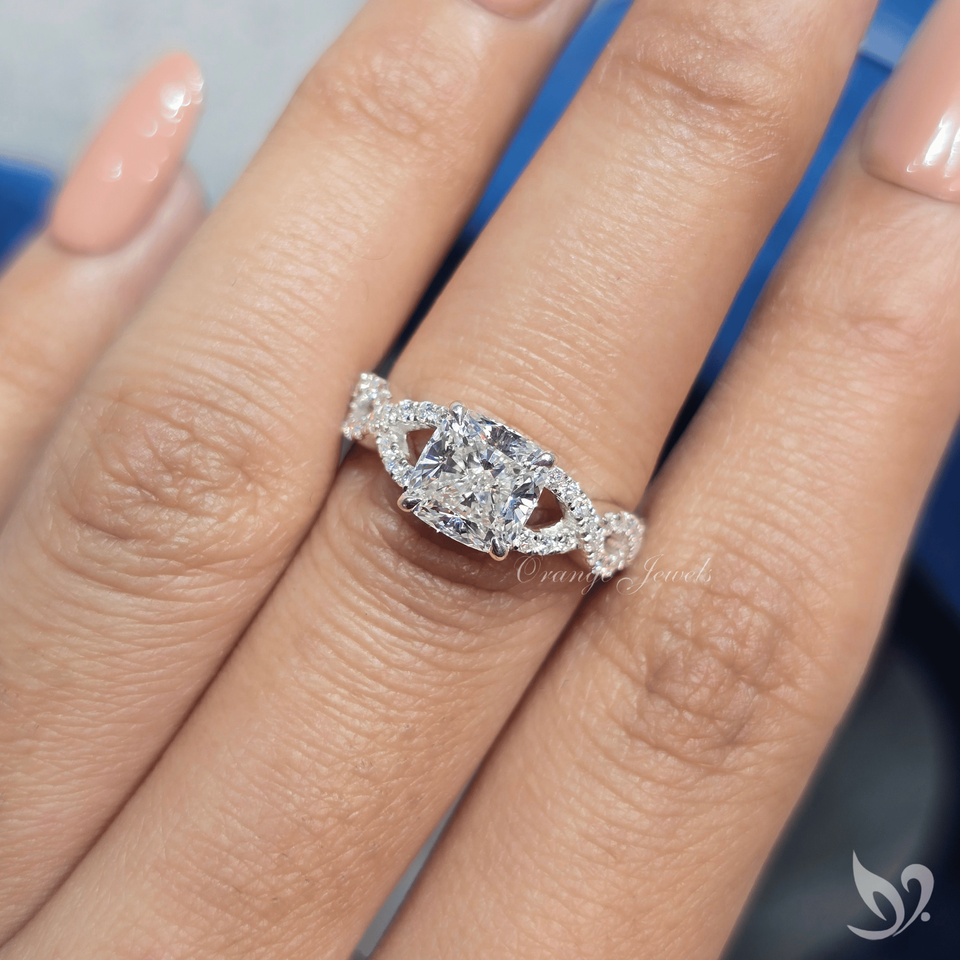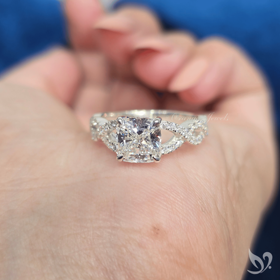 แหวนเพชรทรงคุชชั่น 2 กะรัต แบบฝังเพชรเรียงเป็นแถว วงแหวนบิดเกลียว ดีไซน์แยกส่วน รับรองโดย IGI ทองคำขาว 10K