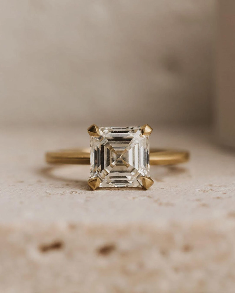 แหวนหมั้นเพชรทรงสี่เหลี่ยมมรกต 2 กะรัต ผลิตจากเพชรเลี้ยงในห้องปฏิบัติการ ประดับบนตัวเรือนทองคำแท้ 14K ดีไซน์หรูหราและเรียบง่าย