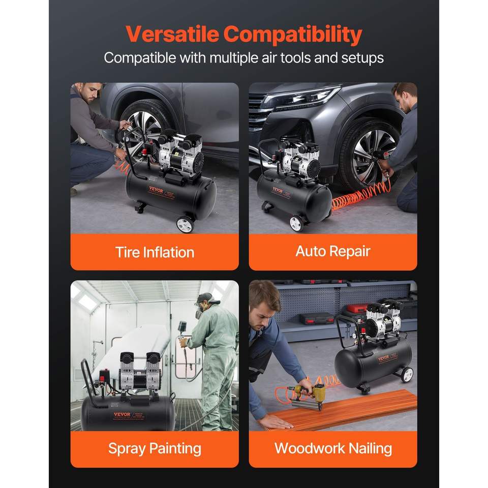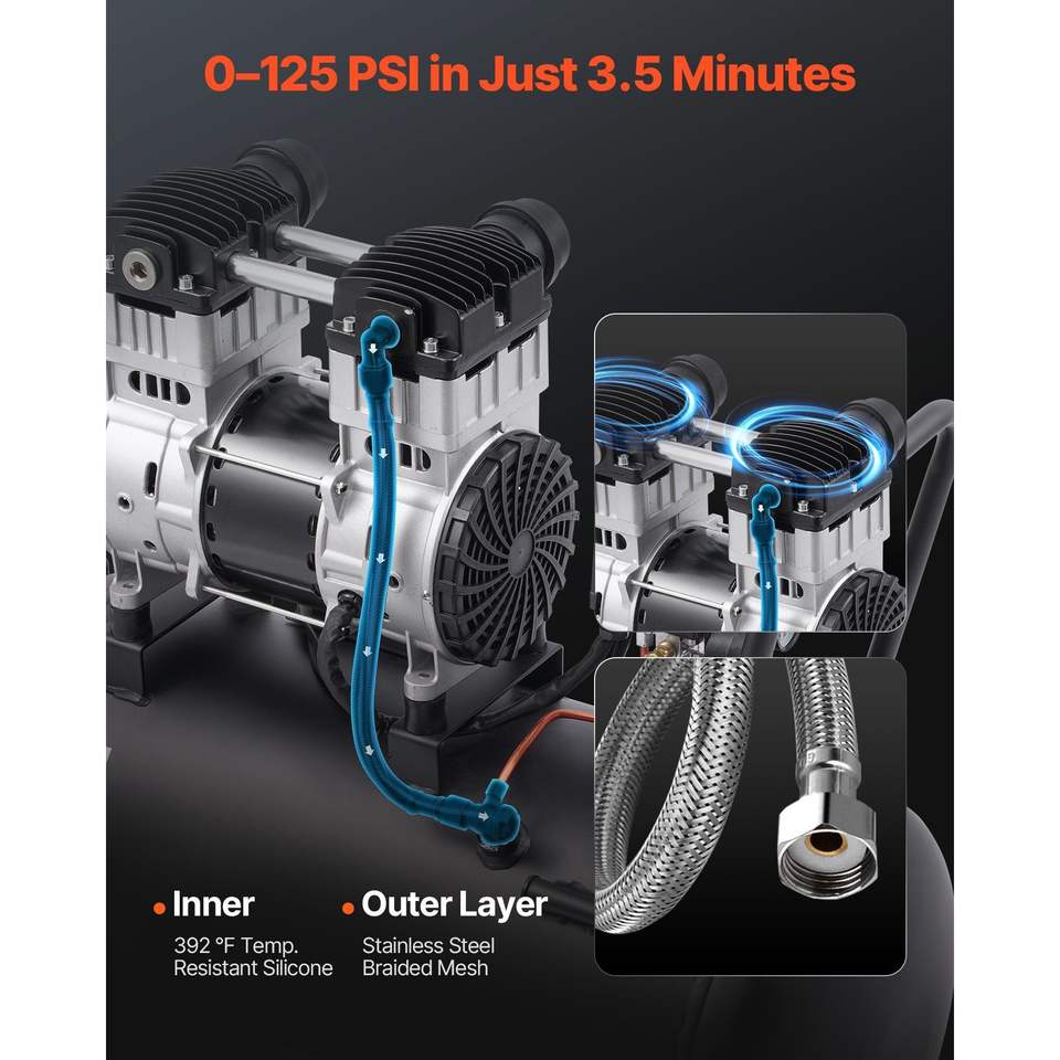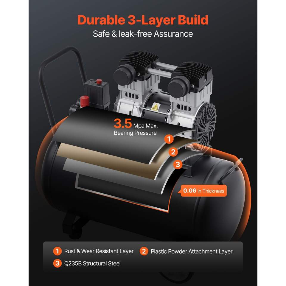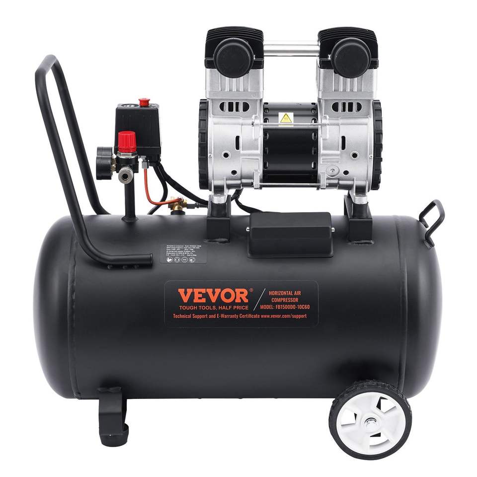 เครื่องอัดอากาศแบบไร้น้ำมัน ขนาดถังเหล็ก 15 แกลลอน 2 แรงม้า 5.3 CFM ที่ 90 PSI เงียบพิเศษ แรงดันสูงสุด 125 PSI ระดับเสียง 78dB สำหรับงานอุตสาหกรรม