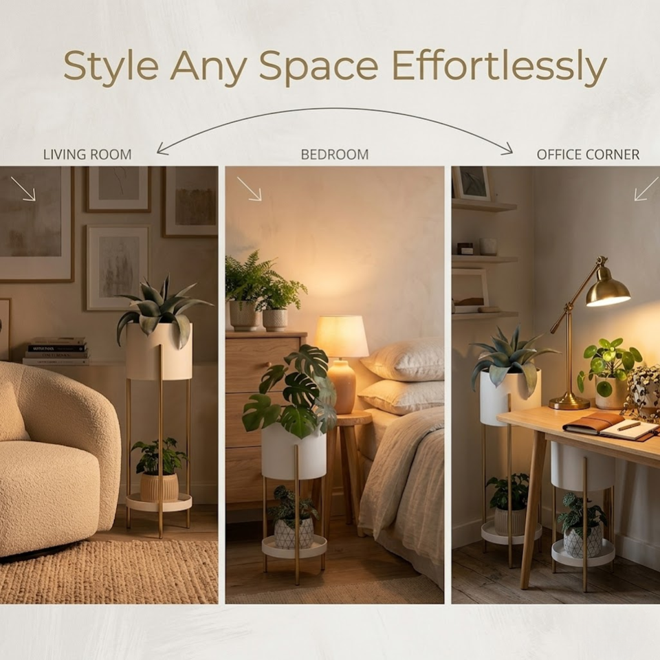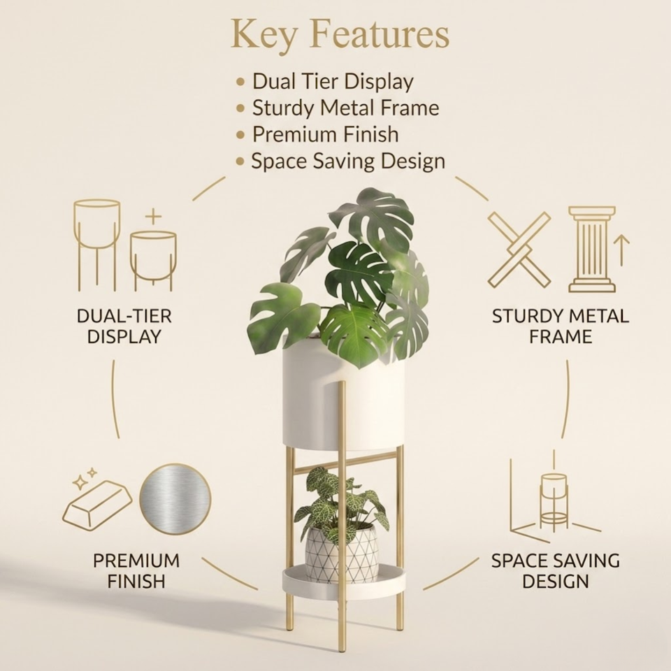 ชั้นวางต้นไม้ในร่ม 2 ชั้น ทำจากอลูมิเนียมหล่อเคลือบผง ดีไซน์ทันสมัย เป็นมิตรกับสิ่งแวดล้อม เหมาะสำหรับตกแต่งบ้าน มุมห้อง วางกระถางดอกไม้ได้หลายกระถาง