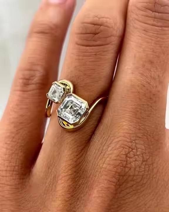 แหวนหมั้นทอง 14K ทรงแอชเชอร์คัท 2 กะรัต เพชรเลี้ยงในห้องปฏิบัติการ ฝังสองเม็ดแบบกึ่งขอบ ประดับเพชร IGI Certified ดีไซน์ทันสมัยแบบ Toi Et Moi