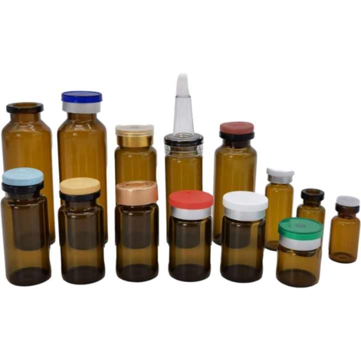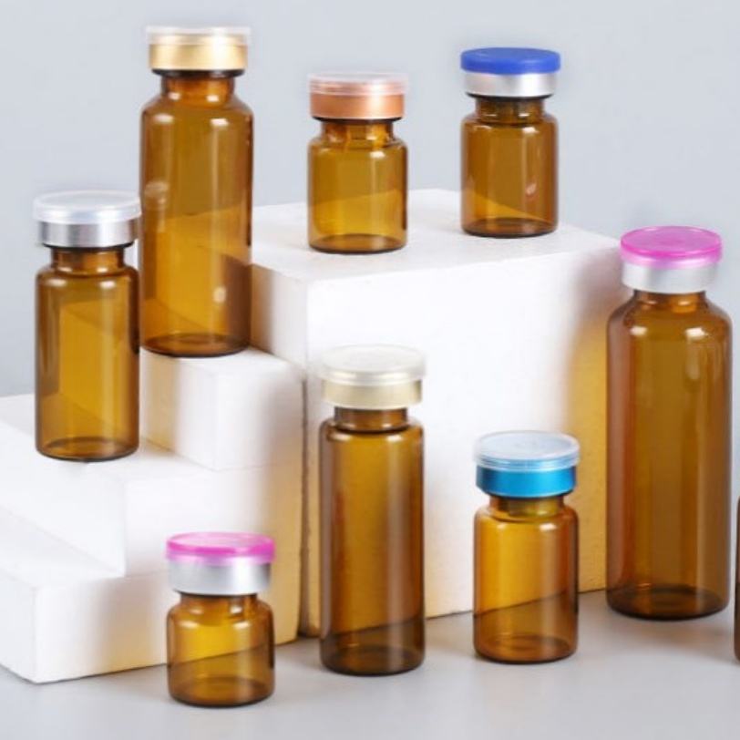 ขวดแก้วใสสีชาขนาด 2-20 มล. พร้อมฝาโลหะ สำหรับบรรจุเซรั่มบำรุงผิวและใช้ในทางเภสัชกรรม