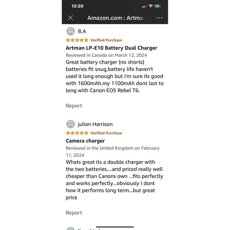 2* LP E10 Batteries, 1* Dual USB Charger, 1* Micro USB CablePackage Contents