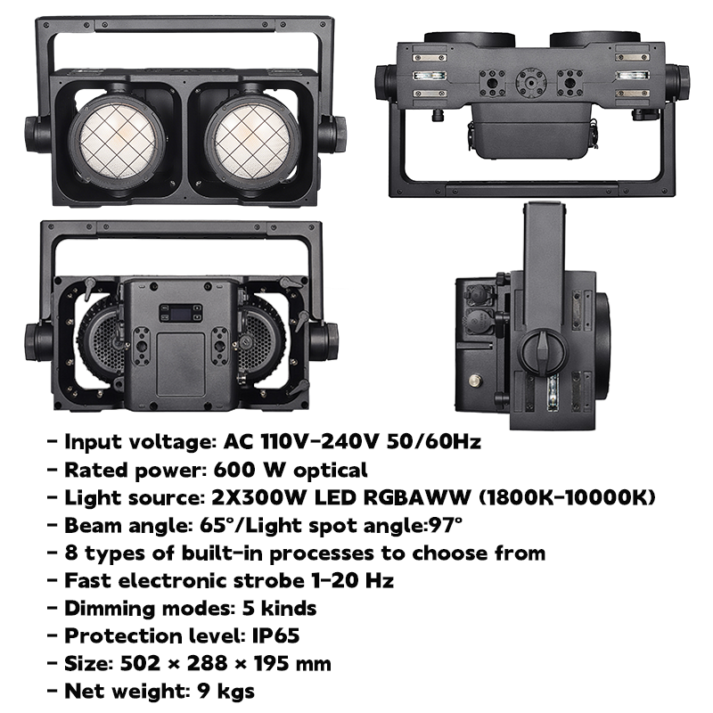 แหล่งกำเนิดแสง:ไฟ LED RGBAWW 2X300W (1800K-10000K)