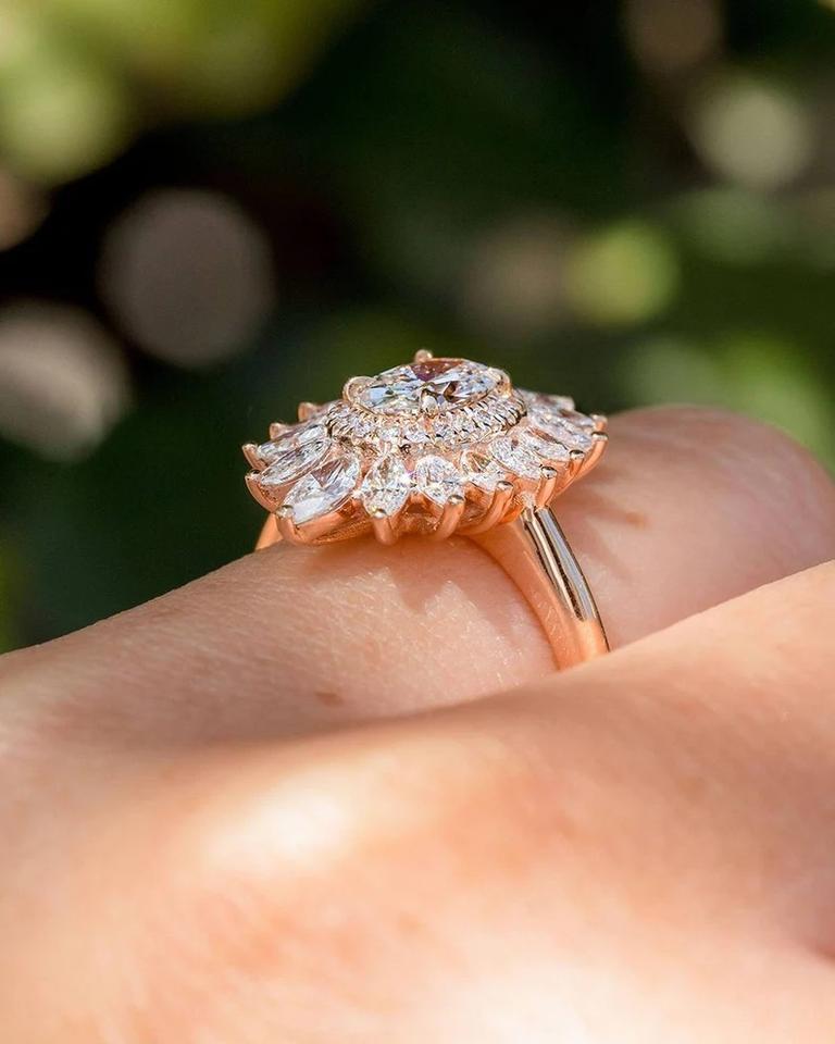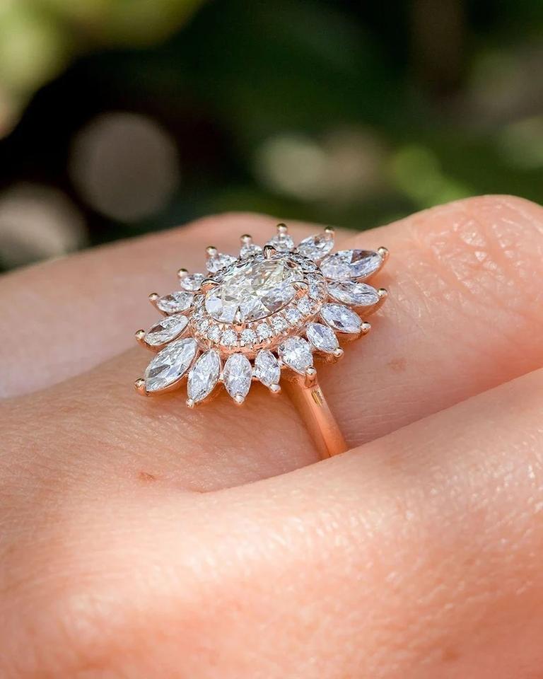 แหวนเพชรเพาะเลี้ยง 3.0 กะรัต ทรงดอกไม้ล้อมเพชร ทองคำแท้ 14K รูปทรงมาร์คีส์ ประดับลายซันเบิร์สต์ แหวนหมั้นสุดหรู