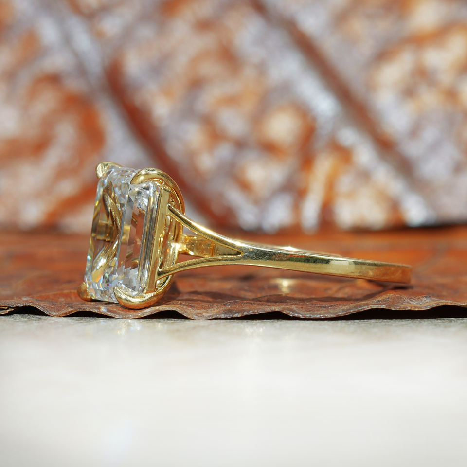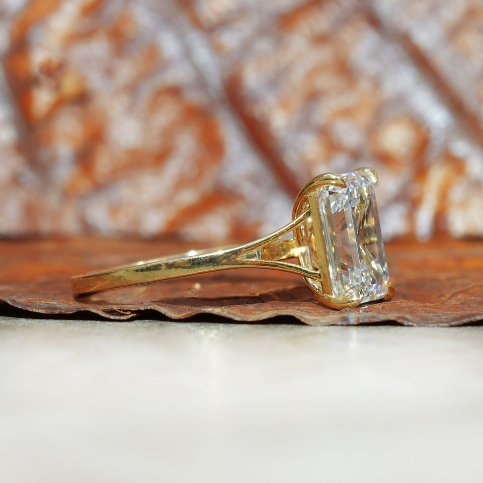 แหวนหมั้นผู้หญิงสไตล์โบฮีเมียนประดับเพชรทรงเอเมอรัลด์ 3.0 กะรัต เพชรเลี้ยงในห้องปฏิบัติการ 3 เม็ด ทองคำ 14K สีเหลือง รับรองโดย IGI
