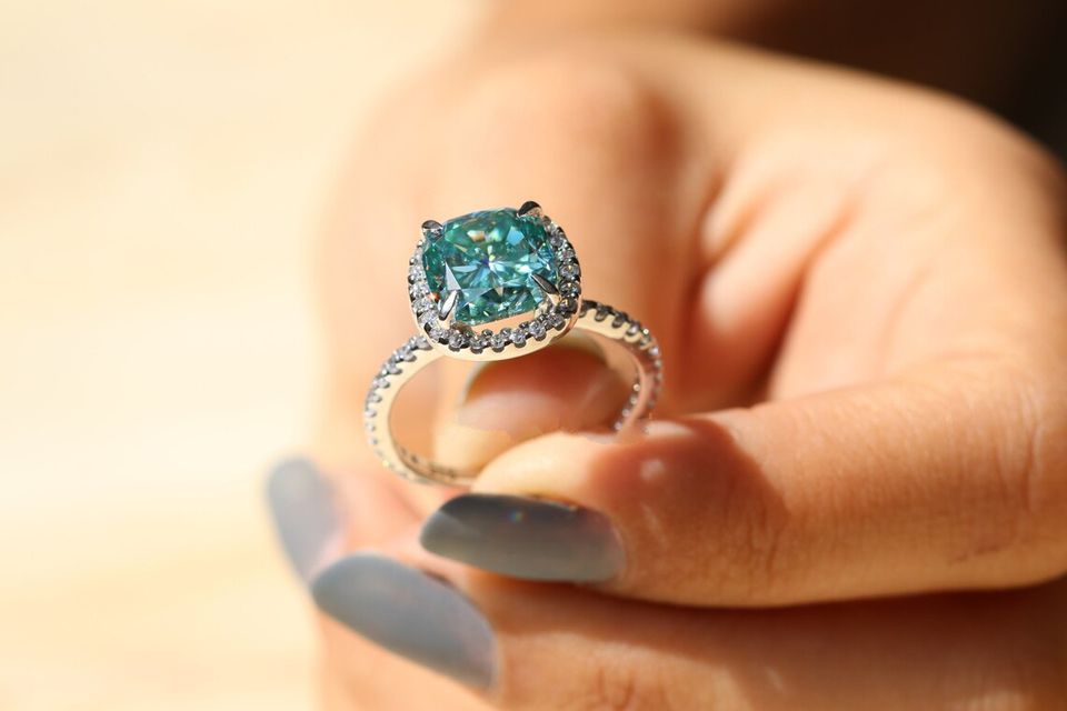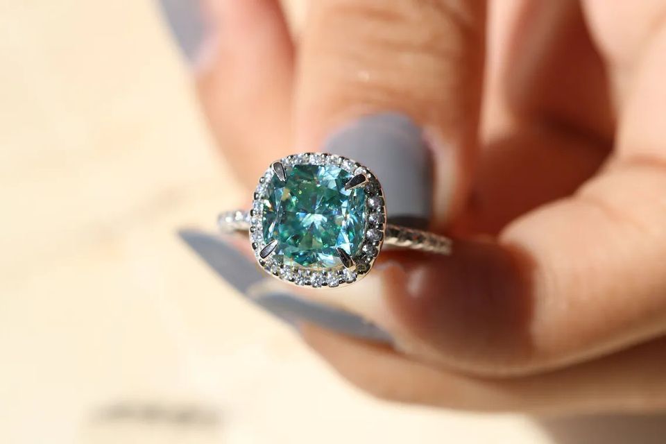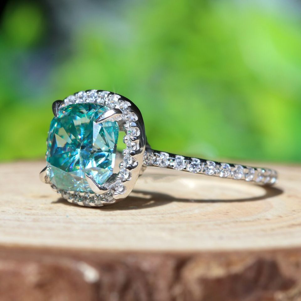 แหวนหมั้นเพชรโมอิสสีฟ้า3.00 CT 925แหวนฮาโลเจนสีเงินแท้โรเดียมชุบ VVS และตั้งค่าความชัดเจน