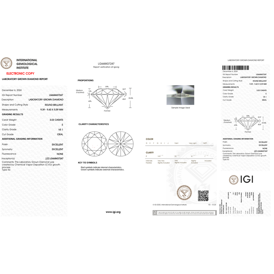 เพชรทรงกลม 3.03 กะรัต VS1/E เพชรเลี้ยงในห้องปฏิบัติการ คุณภาพการเจียระไน EX ขัดเงา สำหรับทำเครื่องประดับ พร้อมใบรับรอง IGI หมายเลข LG668437247