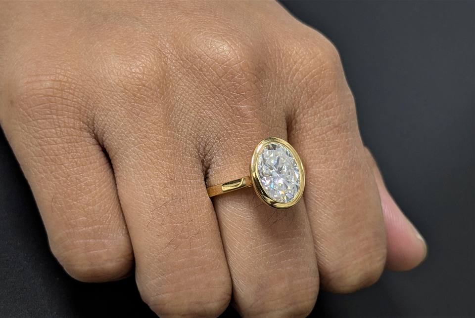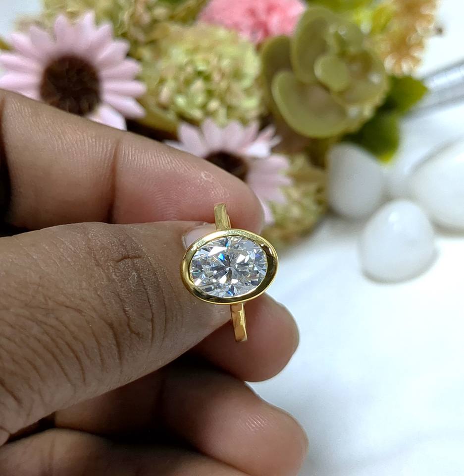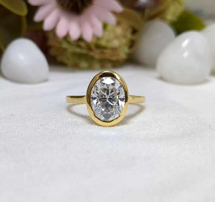แหวนหมั้นทรงรีประดับโมอิสซาไนต์ 3.15 กะรัต แบบฝังขอบ แหวนแต่งงานคลาสสิกสำหรับผู้หญิง ทองคำขาว 14k แท้