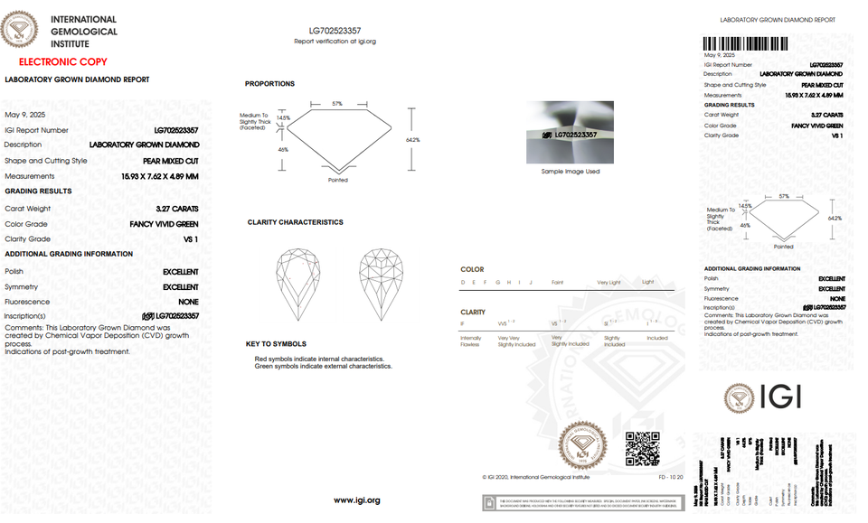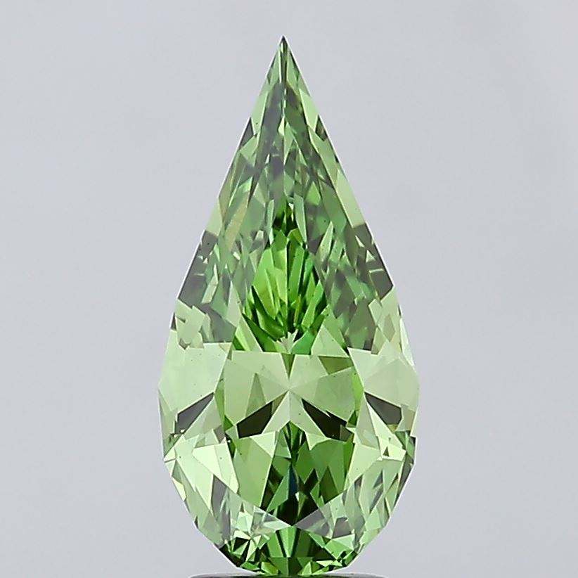เพชรทรงหยดน้ำสีเขียวสดใส น้ำหนัก 3.27 กะรัต VS1 รูปทรงผสม ผลิตในห้องปฏิบัติการ ขัดเงาแล้ว ได้รับการรับรองจาก IGI ความแข็ง 10/10